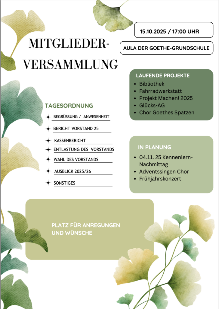 wir laden euch ein zur nächsten Sitzung des Fördervereins am 15.10.25, 17:00 Uhr, in der Aula der Schule. An diesem Tag wird auch ein neuer Vorstand im Förderverein für die Schule gewählt. Bringt euch ein, es geht auch um eure Kinder! Keine Angst, ihr müsst bei Erscheinen kein Amt übernehmen, aber vielleicht habt ihr Ideen, wie man den Schulalltag verbessern kann. Jeder Einzelne kann viel bewegen :-).